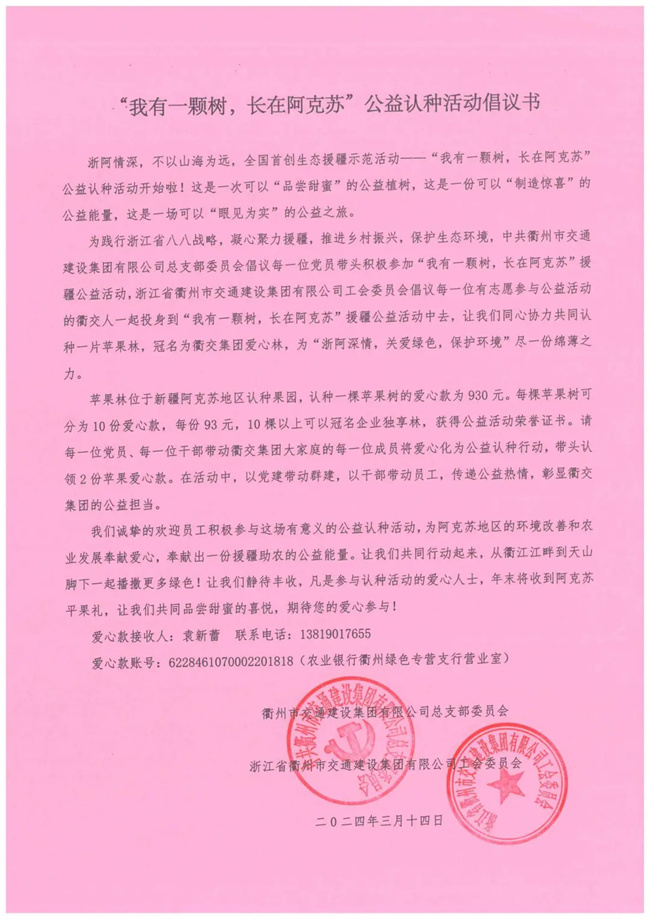 春回大地,萬物復蘇。植樹節(jié)前夕,衢交集團黨總支、工委聯(lián)合發(fā)起了“我有一顆樹,長在阿克蘇”公益認種援疆活動的倡議,倡議黨員干部帶領員工積極參加“我有一顆樹,長在阿克蘇”公益認種活動,為“浙阿深情,關(guān)愛綠色,保護環(huán)境”盡一份綿薄之力。