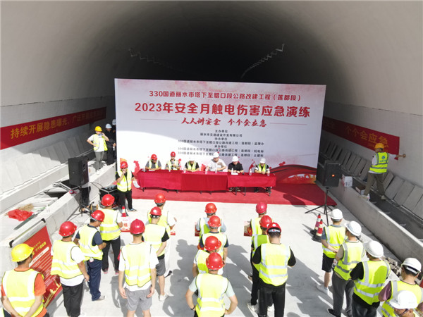 為認(rèn)真落實(shí)2023年全省交通運(yùn)輸系統(tǒng)“安全生產(chǎn)月”活動(dòng)方案要求和衢交集團(tuán)關(guān)于“安全生產(chǎn)月”活動(dòng)通知精神,6月25日下午,衢交集團(tuán)承建的330國(guó)道麗水塔下至臘口段改建工程(蓮都段)1標(biāo)項(xiàng)目部組織開展了觸電應(yīng)急救援演